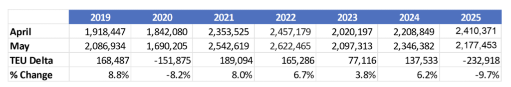 In May 2025, U.S. container import volumes declined to 2,177,453 TEUs — a 9.7% drop from April (see Figure 1). Year-over-year, volumes were down 7.2% compared to May 2024 but 4.3% above May 2019, signaling that overall demand remains elevated versus pre-pandemic norms. Despite strong early-year performance, the May decline marks the first significant contraction reflecting the impact of tariff volatility and growing trade pressures. Cumulatively, total imports for the first five months of the year are up 5.3% compared to the same period in 2024, though the gap has narrowed as evolving trade policies reshape global trade flows.
