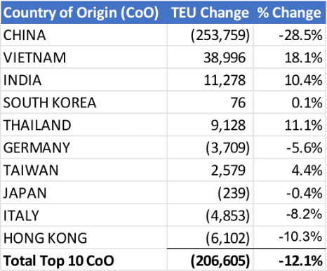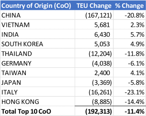 Year-over-year CoO trends show deepening decline from China, continued growth from Southeast Asia.
