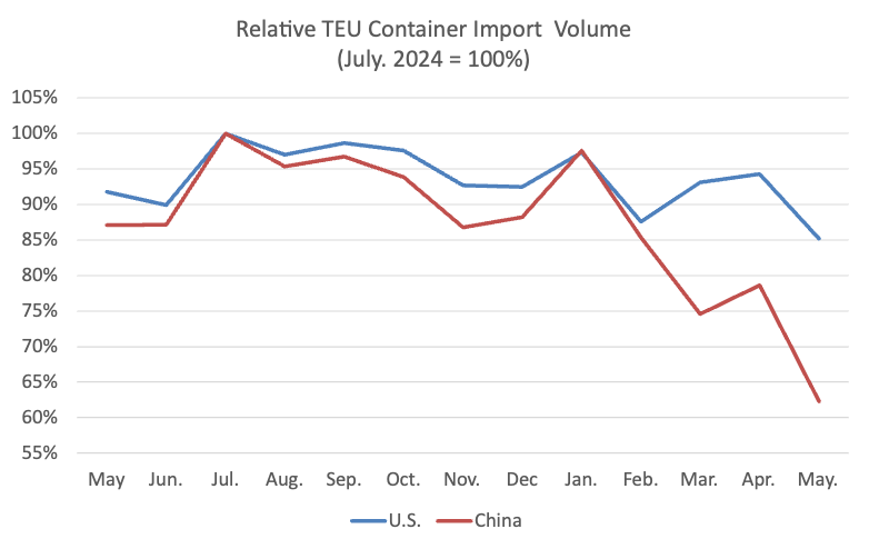 Figure 3: May 2024–May 2025 Comparison of U.S. Total and Chinese TEU Container Volume Relative to Chinese Import Record