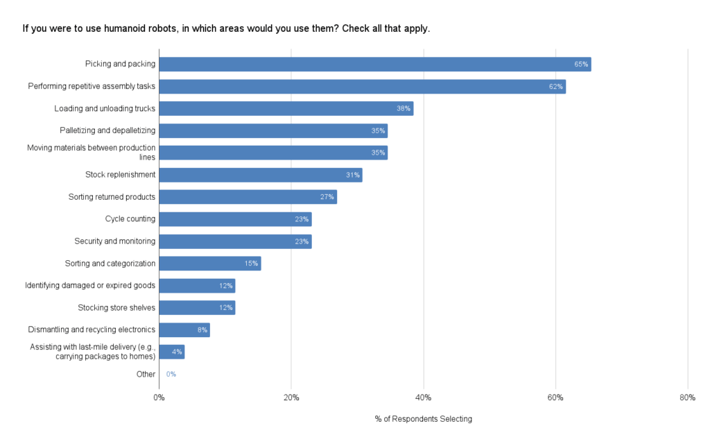 When asked about potential applications, picking and packing (65%) came out on top, followed closely by repetitive assembly tasks (62%) and loading/unloading trucks (38%).