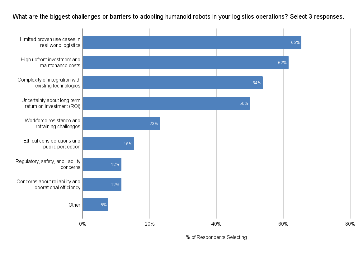 The challenges are clear. The top barrier cited was the lack of proven use cases in real-world logistics (65%). This was followed by high upfront and maintenance costs (62%) and complex integration with existing systems (54%).