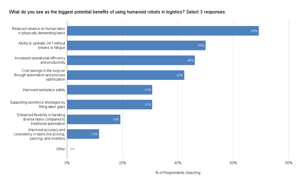 Respondents also highlighted possible benefits, with reduced reliance on human labor in physically demanding tasks (69%) topping the list. Other top choices included 24/7 operations without fatigue (50%) and greater efficiency and productivity (46%).