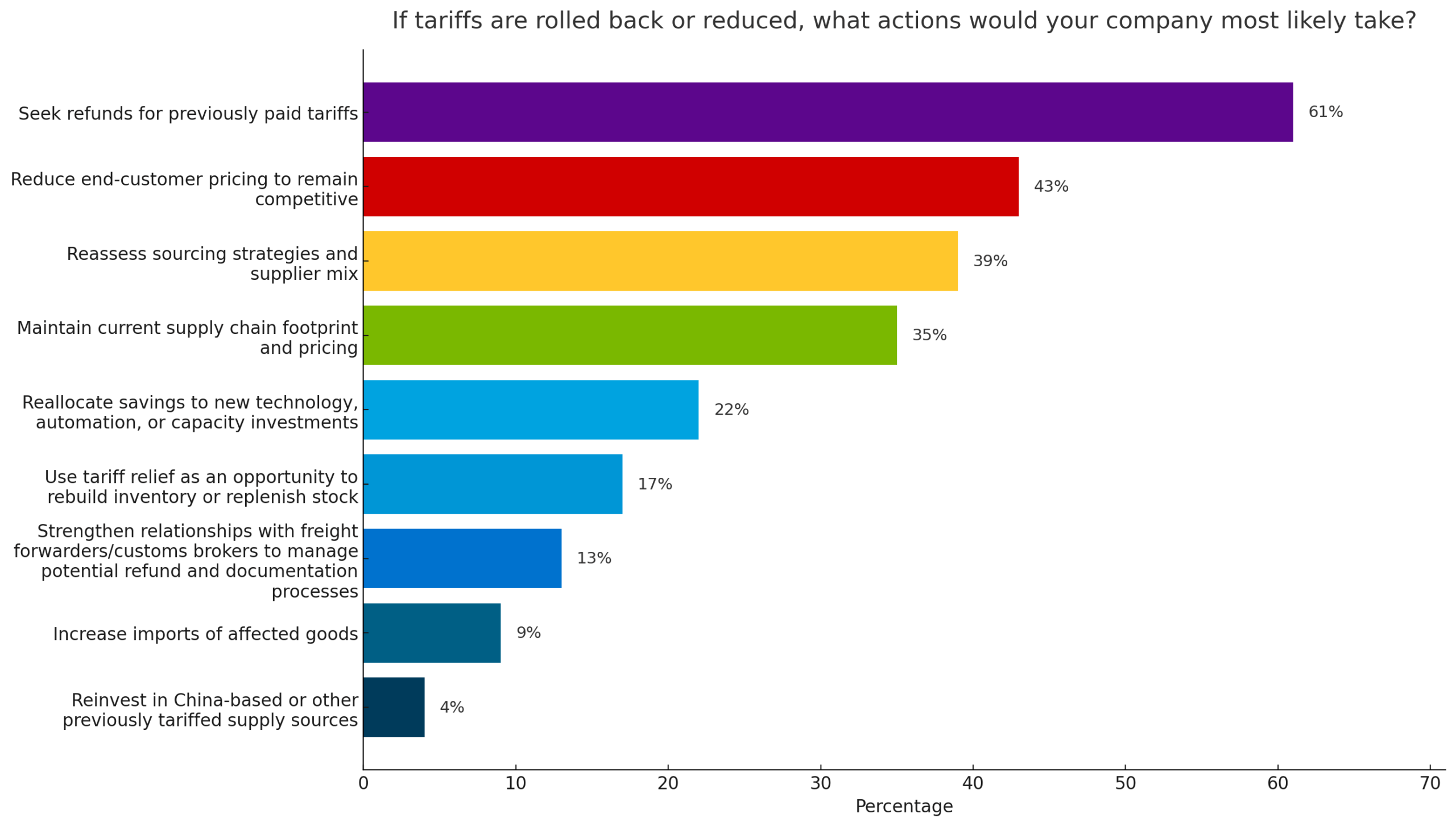 The clearest takeaway: companies would move quickly to recover past tariff payments, with 61% indicating they would pursue refunds. For some businesses, this represents a substantial liquidity opportunity: “The biggest opportunity for us would be…to receive refunds. This would be a good infusion of cash to reinvest in growth.”