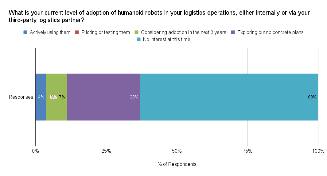 As I shared in “Humanoid Robots In Logistics: Early Curiosity, Lingering Skepticism,” adoption is almost nonexistent, at least among our Indago members. Only one respondent reported actively using humanoid robots in their logistics operations at the time — specifically for picking and packing tasks.