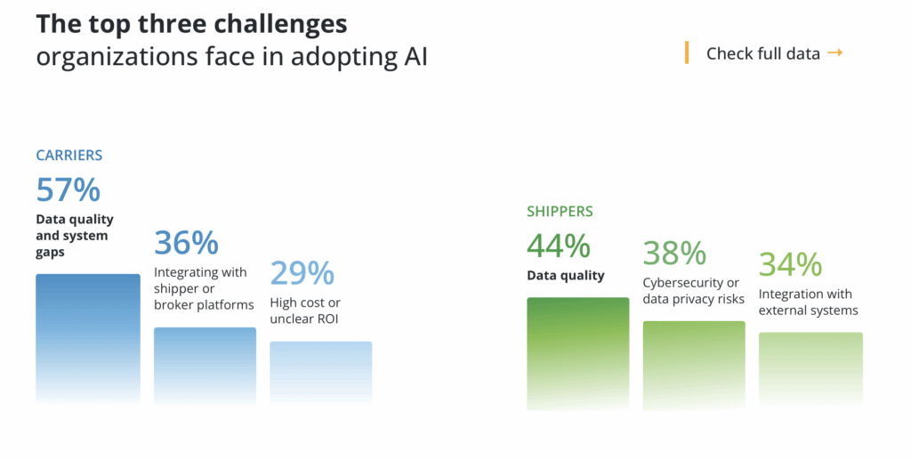 Even for those investing in AI, progress is slowed by a familiar obstacle: data quality. More than half of both shippers and carriers cite poor or inconsistent data as the biggest barrier to success. Integration issues compound the problem, as many struggle to connect internal systems and external partners. AI models can’t make accurate predictions when the data feeding them is incomplete, delayed or siloed.