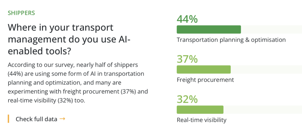 According to our survey, nearly half of shippers (44%) are using some form of AI in transportation planning and optimization, and many are experimenting with freight procurement (37%) and real-time visibility (32%) too.
