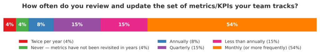 More than half of respondents (54%) review and update their KPIs monthly or more frequently — underscoring how quickly the metrics that matter can shift in today’s volatile environment. However, a notable segment — roughly one in three — revisit their metrics only quarterly or annually, and a few admit they have not revisited them “in years.”