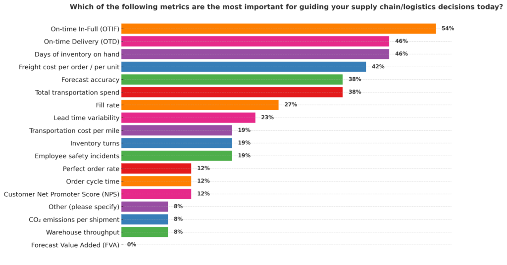 Metrics tied to cost and planning accuracy — such as “Freight Cost per Order or Unit” (42%), “Forecast Accuracy” (38%), and “Total Transportation Spend” (38%) — also remain widely tracked. Yet among this group of respondents, sustainability-related measures such as “CO₂ emissions per shipment” (8%) and even “Warehouse Throughput” (8%) appear to remain peripheral to decision-making.
